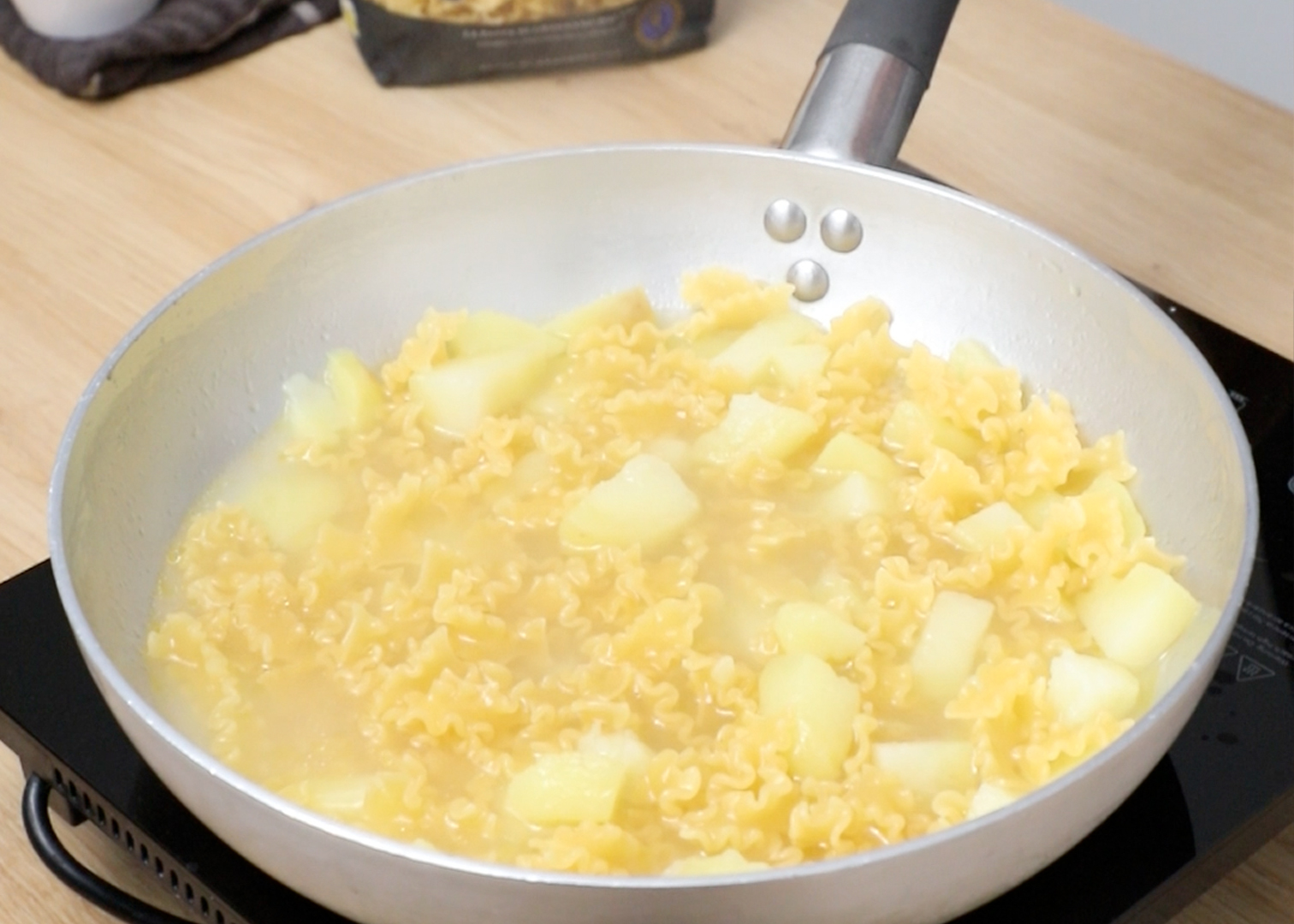 Es importante mantener un hervor suave para que las patatas se ablanden sin romperse, ya que harán de base para el caldo que integrará la pasta después.